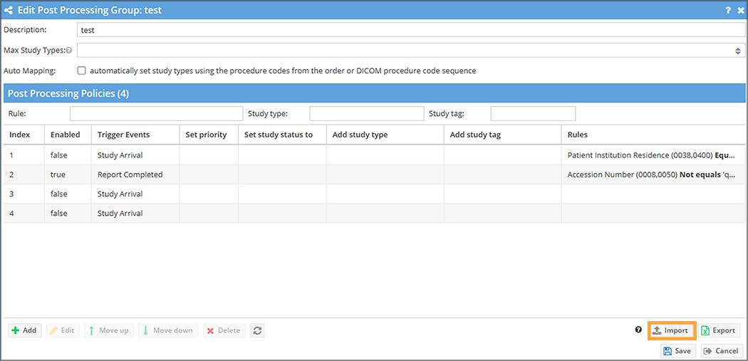 Important Note: If a row contains neither Rules nor Procedure Codes, and if it specifies no modifiers (such as Study Status), the row will fail to import.