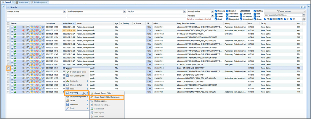 Right-click in the row of the study to be linked. Select Reporting and click Cloud Report Editor/Generator.