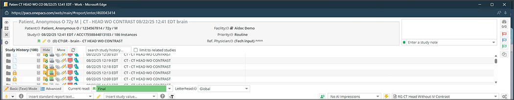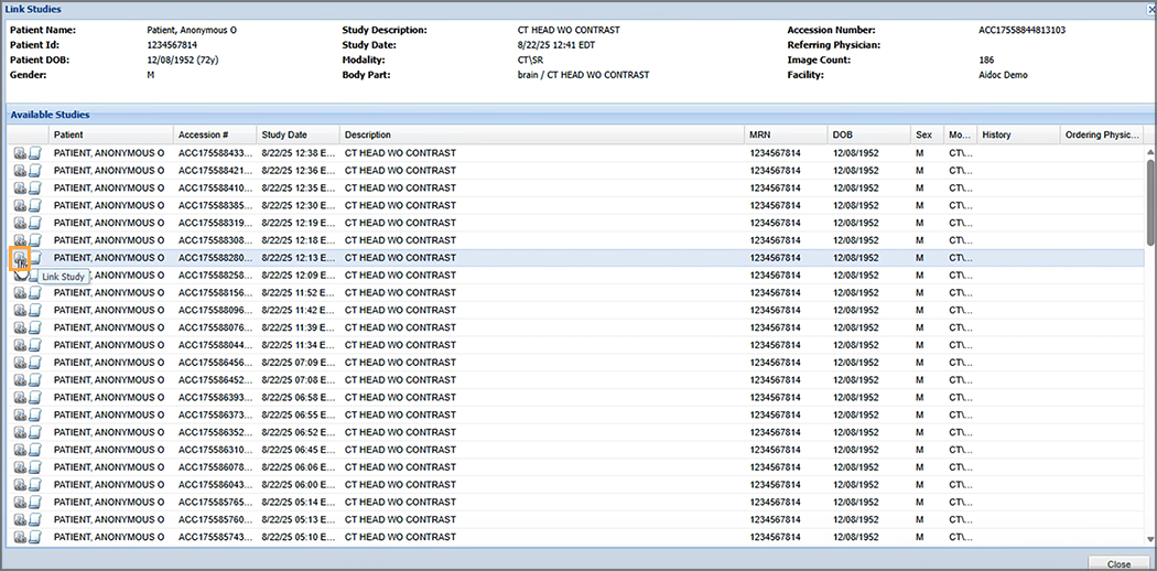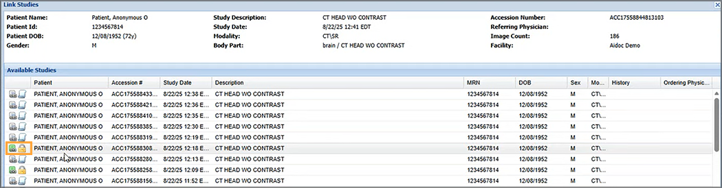 The Linking Studies feature in OnePACS enables users to link related studies within the same order. This feature is particularly useful when patients undergo multiple procedures in the same visit. By interpreting, reporting, and billing these studies together, facilities can improve efficiency, reduce administrative overhead, and enhance clinical accuracy.