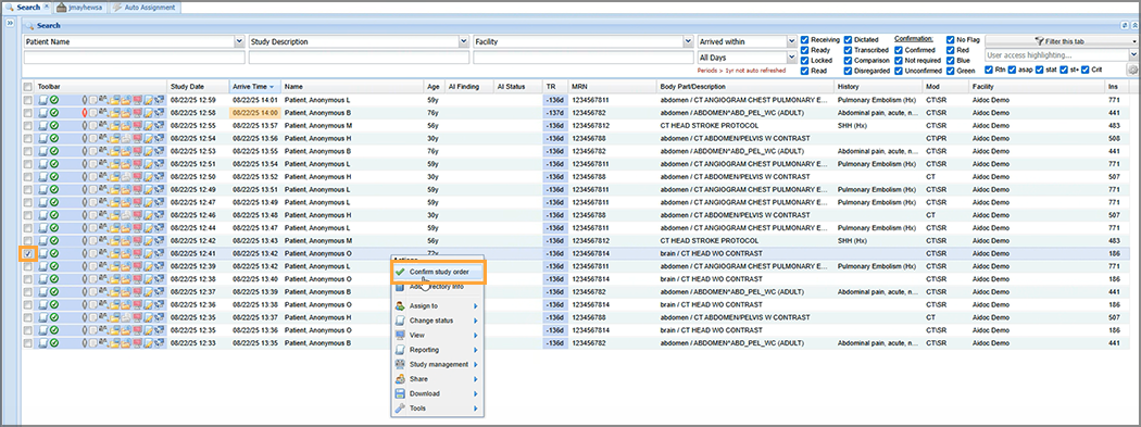 To link studies as part of the confirmation process, right-click in the row of the study and click Confirm study order.