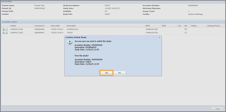 Click Yes on the Confirm Unlink Study to confirm unlinking.