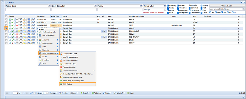To link studies from the OnePACS worklist, right-click in the row of the study. From the context menu, select Study management, then Link Studies.