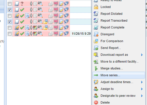 Find the studies on the worklist and select the two studies that contain the series that will be moved. Click the "Manage" Button and the "Move Series..." option.