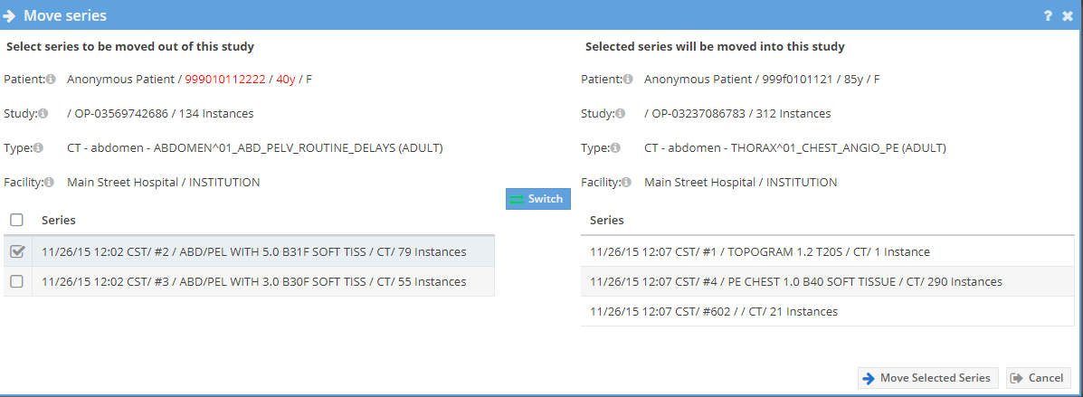 A new window will open. If the patient information is different it is highlighted. Use the "Switch" button to switch where the series will be moved from. Caution should be exercised moving series between studies. Select the checkboxes on the left side series for the series that will be moved into the right hand study. Click the "Move Selected Series" button